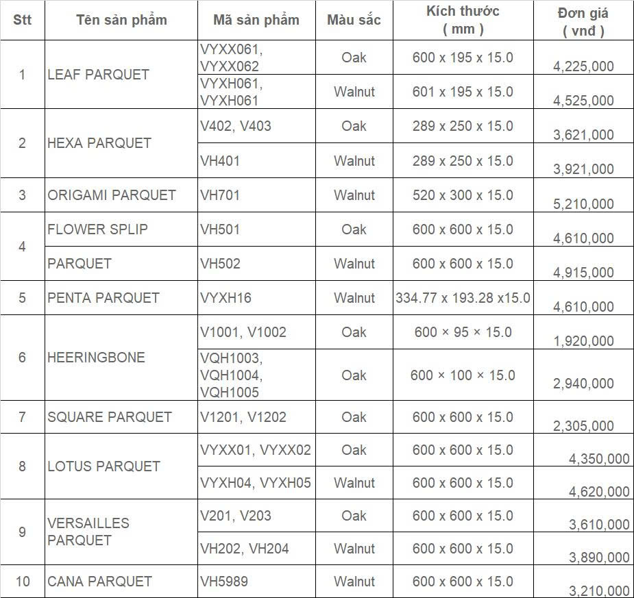 Vinad cung cấp đa dạng các mẫu sàn gỗ hoa văn nghệ thuật với chủng loại gỗ, kích thước và kiểu dáng khác nhau. Dưới đây là bảng giá tham khảo một số dòng sản phẩm tiêu biểu của chúng tôi trong năm 2026.